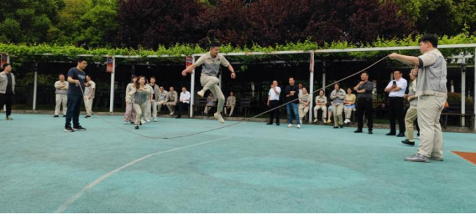 首先進(jìn)行的是穿龍?zhí)K比賽。每支參賽隊伍由 10 名隊員組成,其中 2 人搖繩,8 人跳繩。隨著裁判的一聲哨響,搖繩的隊員迅速揮動手中的繩子,跳繩的隊員們則如敏捷的飛燕,一個接一個地穿過飛舞的跳繩。他們步伐整齊,節(jié)奏一致,口中喊著響亮的口號,為了團(tuán)隊的榮譽(yù)而奮力拼搏。現(xiàn)場觀眾的加油聲、歡呼聲此起彼伏,整個賽場沉浸在一片歡樂的海洋中。這個項目不僅考驗了大家的協(xié)調(diào)性和敏捷性,還考驗了團(tuán)隊成員之間的默契。有的隊伍配合得天衣無縫,動作流暢;有的隊伍則在歡聲笑語中出現(xiàn)了一些小插曲,但正是這些小插曲,為運動會增添了不少樂趣。