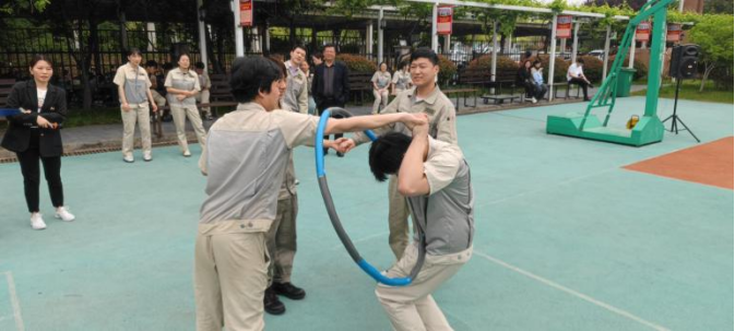 接下來的一圈到底比賽同樣精彩紛呈。4 人手拉手圍成圓圈站立,全程不得松手,呼啦圈掛在一人手臂上,裁判喊開始后,隊員需通過扭動身體、抬腿、低頭等方式,將呼啦圈從自己身上穿過并傳遞給下一人,完成三圈傳遞結(jié)束,用時最短的隊伍獲勝。比賽中,各隊隊員們緊密合作,充分發(fā)揮自己的靈活性和協(xié)調(diào)性,想盡辦法加快傳遞速度。有的隊伍利用身體靈活快速完成,有的隊伍不小心卡住了,但隊友們絲毫沒有抱怨,而是相互鼓勵,共同完成任務(wù)。則身體笨重采用了快速穿越的方式,有的隊伍則注重保持隊伍的穩(wěn)定性,在穩(wěn)中求勝。最終,鈑二代表隊?wèi){借高效的傳遞技巧和緊密的團(tuán)隊協(xié)作,贏得了一圈到底比賽的冠軍。